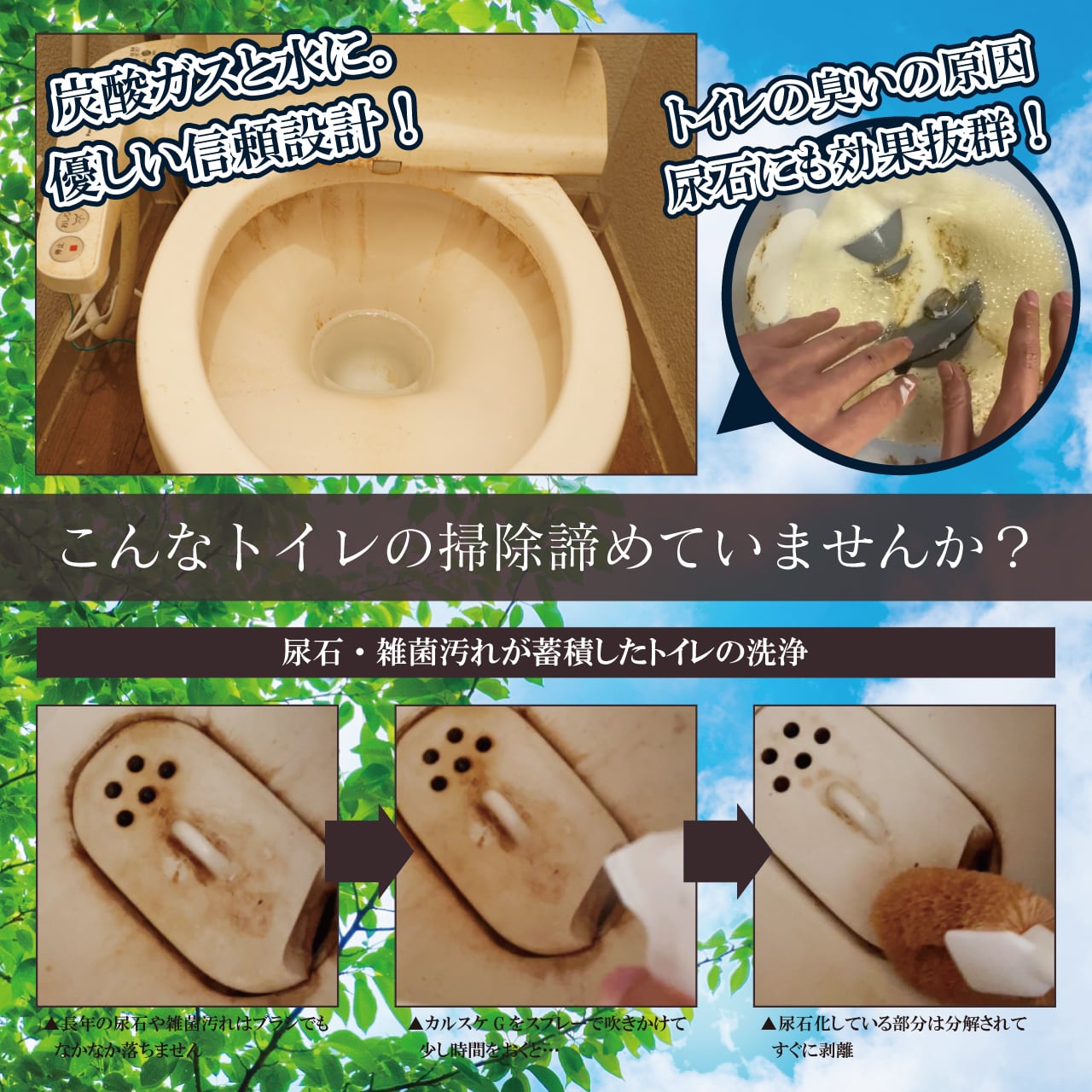 強力な洗剤でトイレを洗ったけど、黄ばみが落ちない。ヤスリで削ると便器にダメージが…。 そんな汚れ(尿石など)にお悩みの方にピッタリの製品がこちら。 サッとかけるとパッと化学反応を起こし、びっくりするくらい汚れが落ちます。 何より手が触れても大丈夫。カルシウムに対して反応する為、尿石、水道のカルキのスケールにお困りの方、一度お試しください。なくてはならない一品になります。
