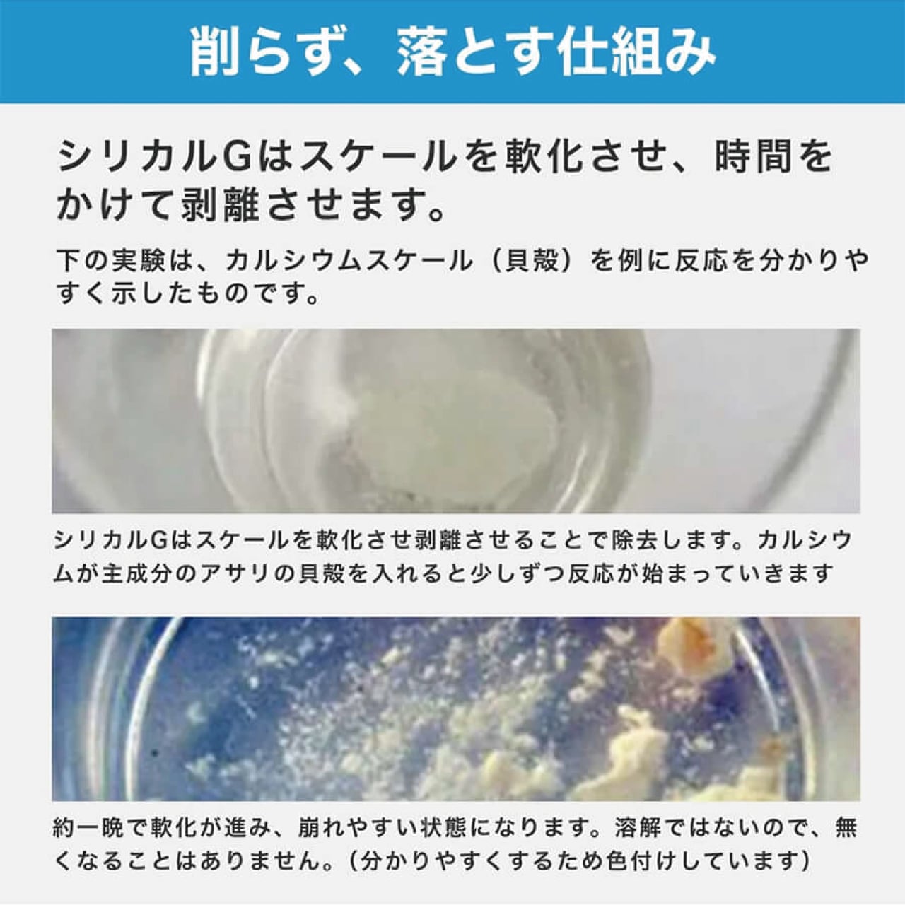 シリカルGはスケールを「溶かして消す」のではなく、時間をかけて軟化させ、表面から浮かせる“剥離型”設計です。