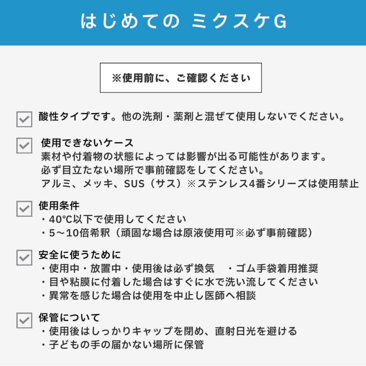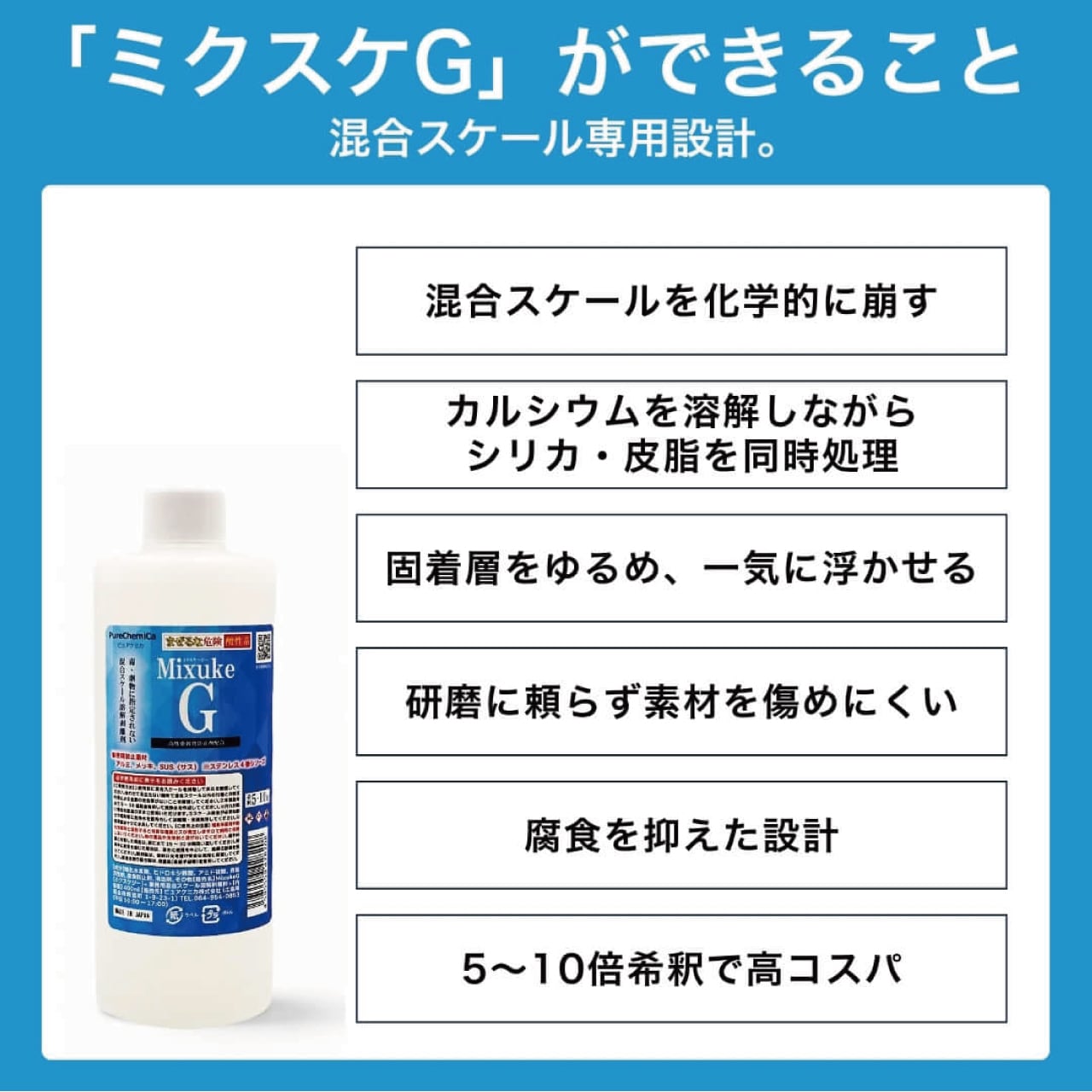 「ミクスケG」は、あらゆる混合溶解物に対して優れた効果を発揮します。水回りや機器に付着した頑固な汚れにお困りの方に最適です。この製品を使用することで、手軽に汚れを効果的に除去できます。作業後は、清潔感のある環境を取り戻しますので、ぜひお試しください!
