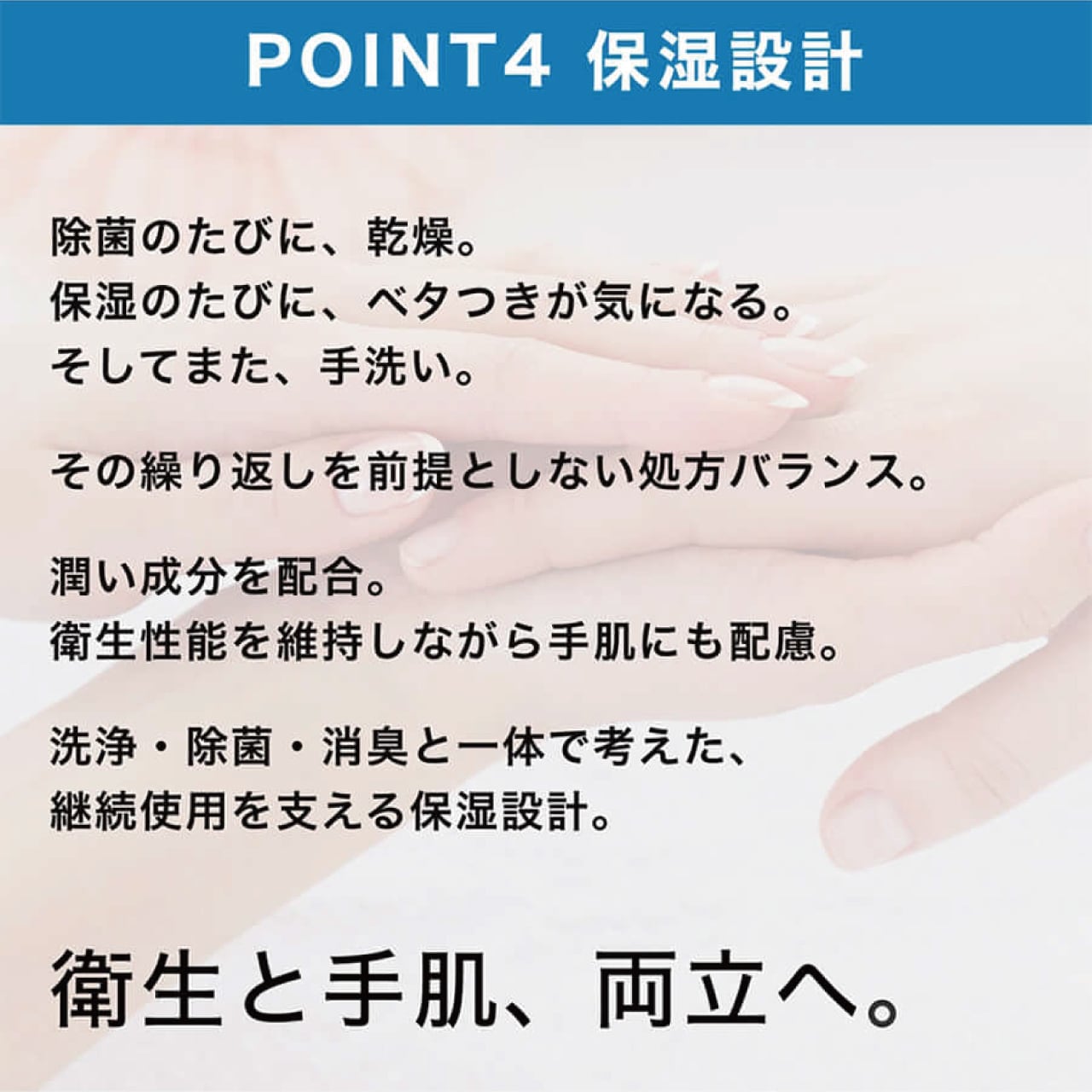 手を洗い、アルコールで除菌し、乾燥が気になってハンドクリームを塗るそんな「手洗いの無限ループ」に着目。保湿成分を配合し、手肌への配慮と清潔環境づくりを同時にサポートします。