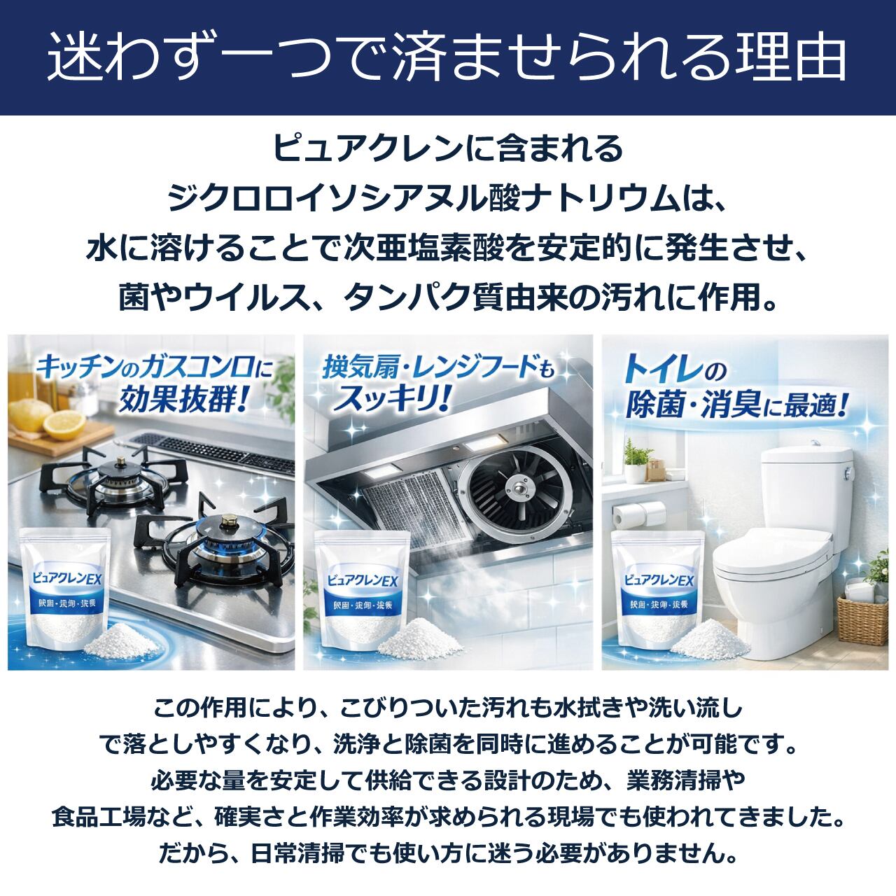 現場レベルの洗浄力を、日常清掃で使える形に。 洗浄と除菌を同時に進める、粉末タイプの除菌洗浄剤。ピュアクレンEXは、タンパク質汚れや油汚れを分解しながら、同時に除菌まで行える微発泡タイプの除菌洗浄剤です。