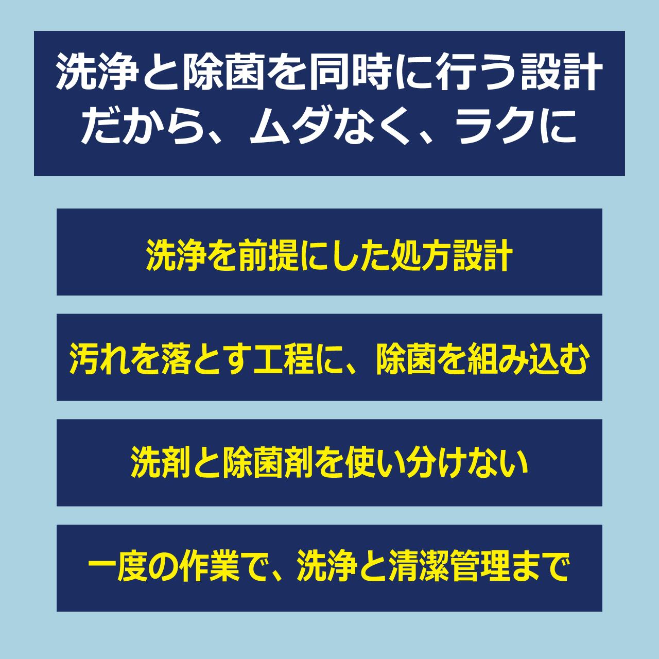 洗浄と除菌を同時に済ませるため作業時間の短縮が可能。また次亜塩素酸は、汚れを落としてからでないと除菌効果が十分に発揮されにくい特性があります。ピュアクレンEXは、洗浄と除菌を同時に進めることで、その弱点を補う設計です。